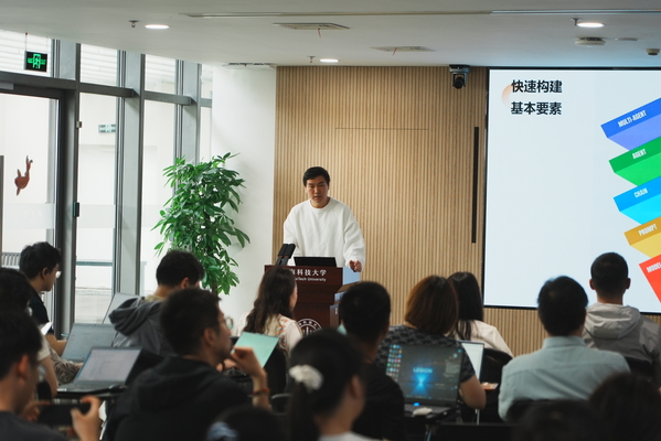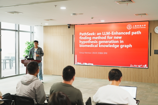 在案例分享环节,四个优秀项目展现了师生们将AI技术与实际需求相结合的创新实力。信息科学与技术学院和生命科学与技术学院的跨学科本科生团队代表洪沐天展示的一等奖项目“PathSeek”,开创性地融合大语言模型与生物医学知识图谱,能够自动生成可信的科学假说;信息科学与技术学院教师闻天明带来的二等奖项目“财务报销智能体”,通过智能问答和智慧报表功能,显著优化了财务管理流程;生命科学与技术学院学生于果的“科研资料检索流程架构”(赛道优秀奖)和物质科学与技术学院王天一的“校园非机动车挪车系统”(大赛三等奖),则从科研效率和校园生活两个维度展现了AI应用的多元价值。