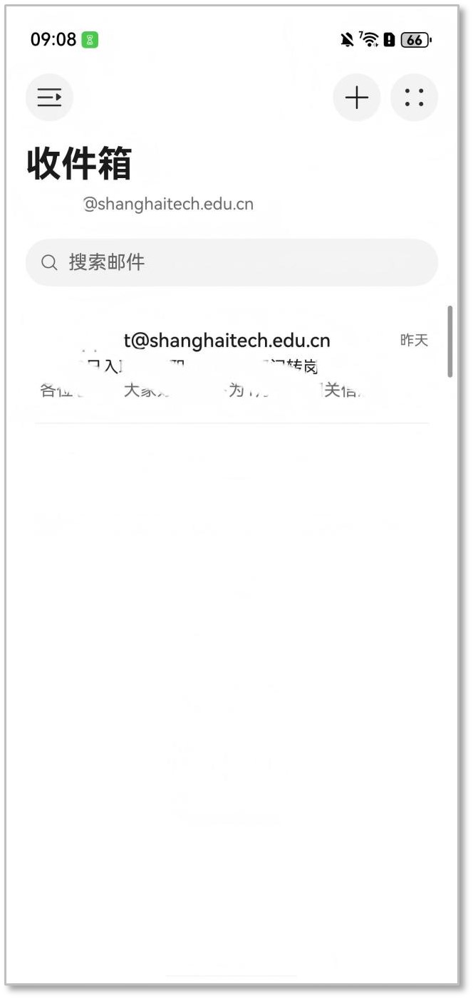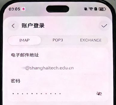 接收服务器配置:imap.shanghaitech.edu.cn,加密连接类型: SSL/TLS,端口: 993