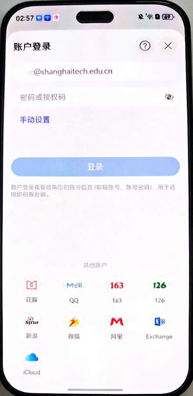 2、进入界面后,先输入您的xxx@shanghaitech.edu.cn邮箱账号后,再点击手动配置,如下图