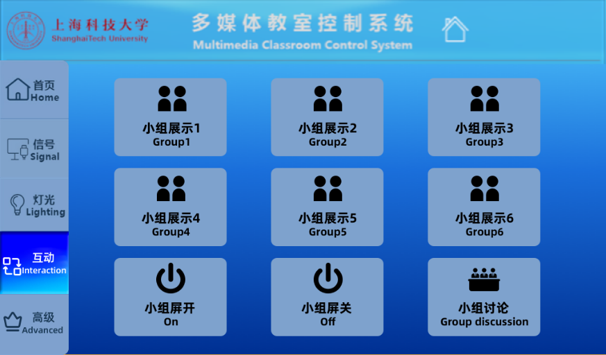 用例1:多媒体教室设备完全开启后,选择“互动”页面:点击“小组讨论”,可以将各小组的信号画面展示在对应的小组屏上,教室主屏幕仍然为老师所选的信号画面;点击“小组展示1”,可以将小组1的的信号画面展示在小组1对应的小组屏和教室主显示屏上(LED、教学互动一体机、投影机),其他个小组画面保持不变。