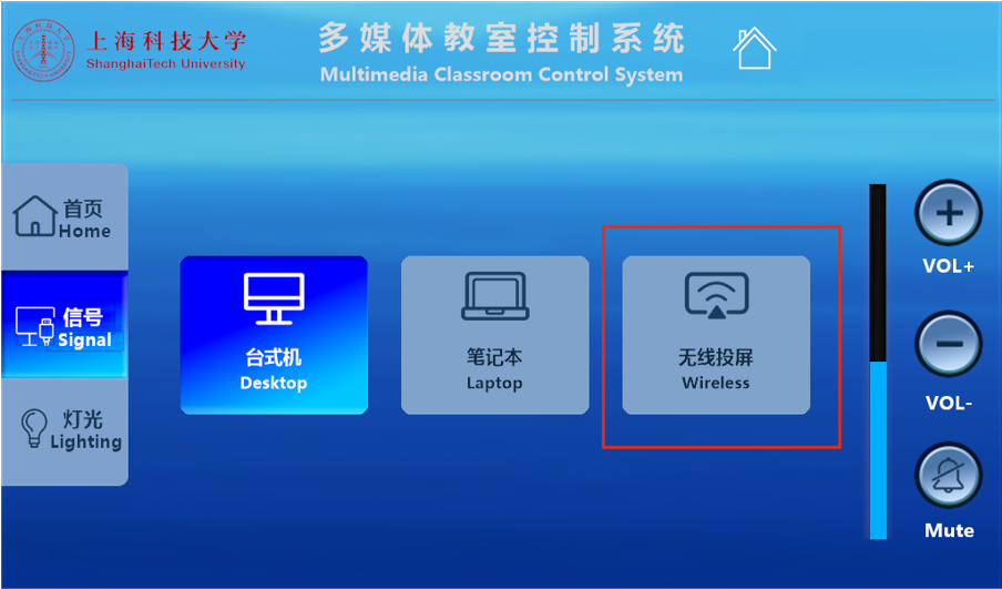 A:第一步,在讲台触摸控制屏上选择信号源为无线投屏;