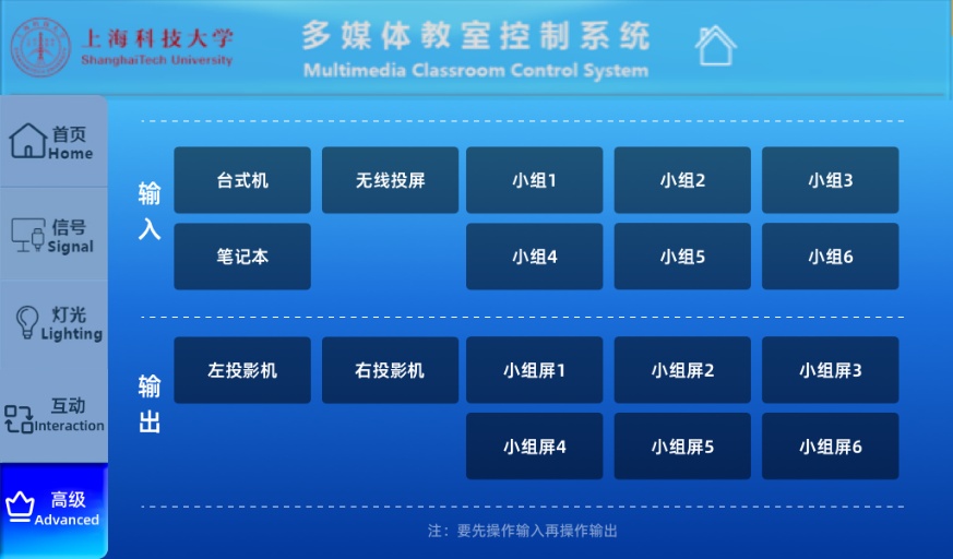 用例2:以下图为例,保持点击“高级”3秒,进入操作页面:输入点击“小组1”,然后输出选择“小组屏1”、 “小组屏2”、“小组屏3”,学生小组1的的信号画面可以同时展现在所选的三个屏幕上,同时可以将输入点击“小组4”,然后输出选择“左投影机”,学生小组4的的信号画面可以同时展现在“左投影机”对应的投影幕布上。此类使用方式信号源和显示设备的搭配方式更为多样灵活。