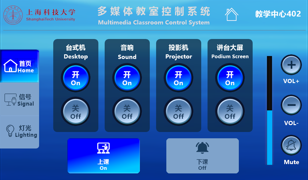 A:使用结束后,可以通过讲台右上角的触摸控制屏,点击“首页”页面“下课”按键,关闭教室多媒体设备。